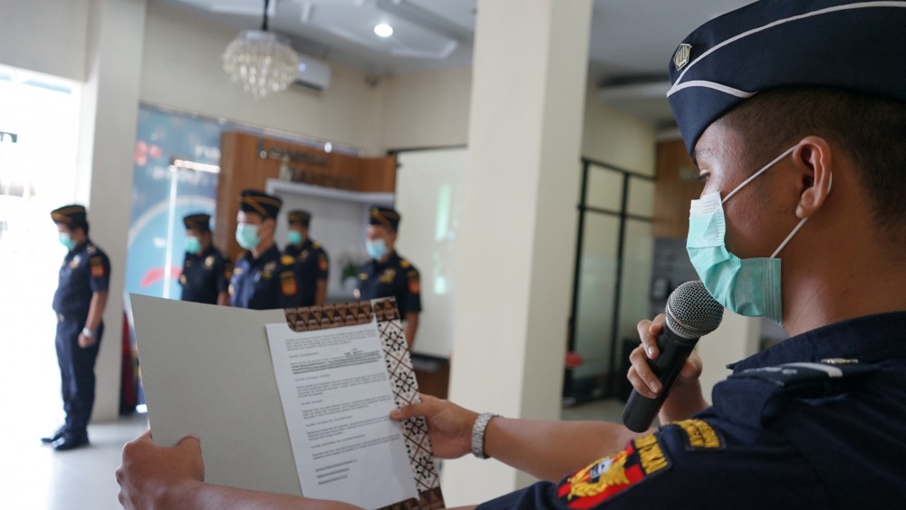 Ambon (7/12) – Dalam masa pandemi, mematuhi protokol kesehatan adalah hal yang penting dalam mencegah penyebaran Covid-19. Dalam era new normal, aktivitas sudah mulai dilakukan kembali dengan tetap memperhatikan anjuran pemerintah seperti menghindari kerumunan, selalu menggunakan masker jika beraktifitas di luar rumah, dan rajin mencuci tangan. Hari ini, Bea Cukai Ambon kembali mengadakan apel perdana di masa pandemi Covid-19 di lobi kantor Bea Cukai Ambon dengan tetap menjaga jarak dan menggunakan masker. Komposisi pegawai apel pun hanya terdiri peserta sebanyak 6 orang, petugas apel 3 orang, pembina apel, perwira apel, komandan apel, serta operator. Selebihnya, pegawai mengikuti apel melalui zoom meeting dengan berpakaian PDH lengkap dan mengambil posisi berdiri dengan sikap sempurna.