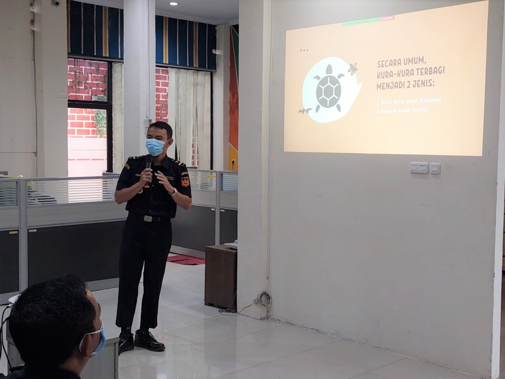 Ambon(09/10/2021) Senin (04/10) Bea Cukai Ambon menggelar Bastori Series II yang dilaksanakan secara hybrid baik yang ada di kantor maupun yang berada di kediaman masing-masing. Yudho Kusumo Hadi Pejabat Fungsional Pemeriksa Bea Cukai berkesempatan menjadi pemateri. Yudho bercerita tentang jenis kura-kura yang hidup di Indonesia. Ia menjelaskan 7 jenis kura-kura. Satu per satu dibahas detailnya seperti umur kura-kura, habitat aslinya, dan ukuran dari masing-masing jenis kura-kura. Di akhir pemaparan Yudho menyampaikan bahwa ada pesan yang bisa diambil dari seekor-kura kura. “Speed doesn’t matter, forward is forward atau jika diartikan adalah tidak penting seberapa cepat kita, namun progress tetap progress”,pungkas Yudho.