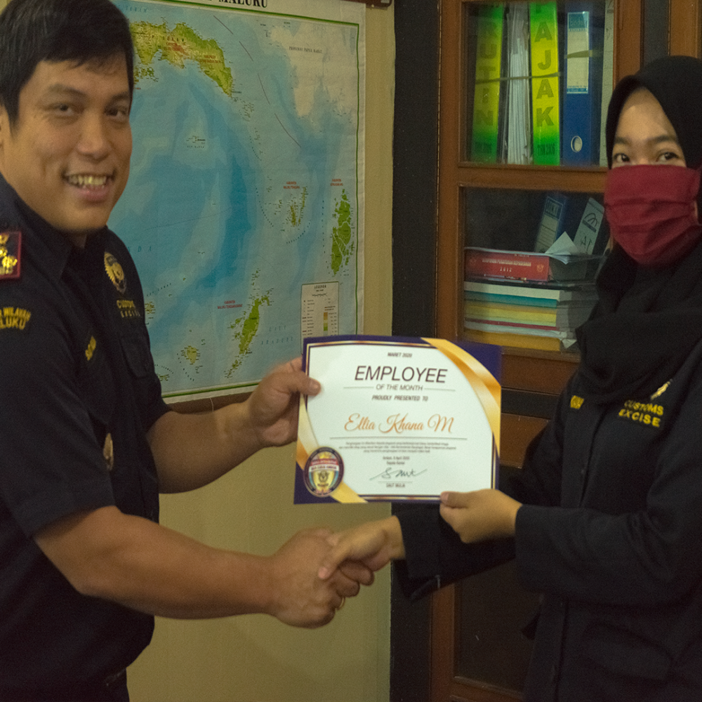 Tidak lengkap apabila awal bulan tidak ada penghargaan untuk pegawai. Hari ini (14/04) salah satu pegawai Bea Cukai Ambon mendapatkan penghargaan sebagai Employee Of The Month di bulan Maret. Penghargaan ini diberikan kepada Ellia Khana Margareta dari Subseksi Penyuluhan dan Layanan Informasi (PLI). Sama halnya dari bulan bulan sebelumnya, kategori penilaiannya diambil dari absensi, kedisiplinan, sikap, dan juga pengisian logbook harian. Bertempat di Ruang Kepala Kantor, Saut Mulia selaku Kepala Kantor memberikan langsung penghargaan dan juga sebuah buku motivasi kepada Ellia Khana yang juga sebagai Pejabat Pengadaan Barang dan Jasa.