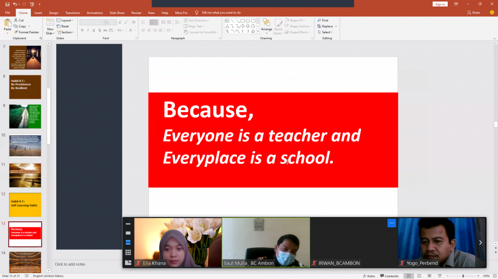 (Ambon - Jumat, 13 November 2020) Capacity building dengan tema 7Habits of Highly Productif People, dibawakan dengan sangat menarik oleh Kepala Kantor Bea Cukai Ambon, Saut Mulia, dan diikuti oleh seluruh pegawai Bea Cukai Ambon melalui Zoom meeting.