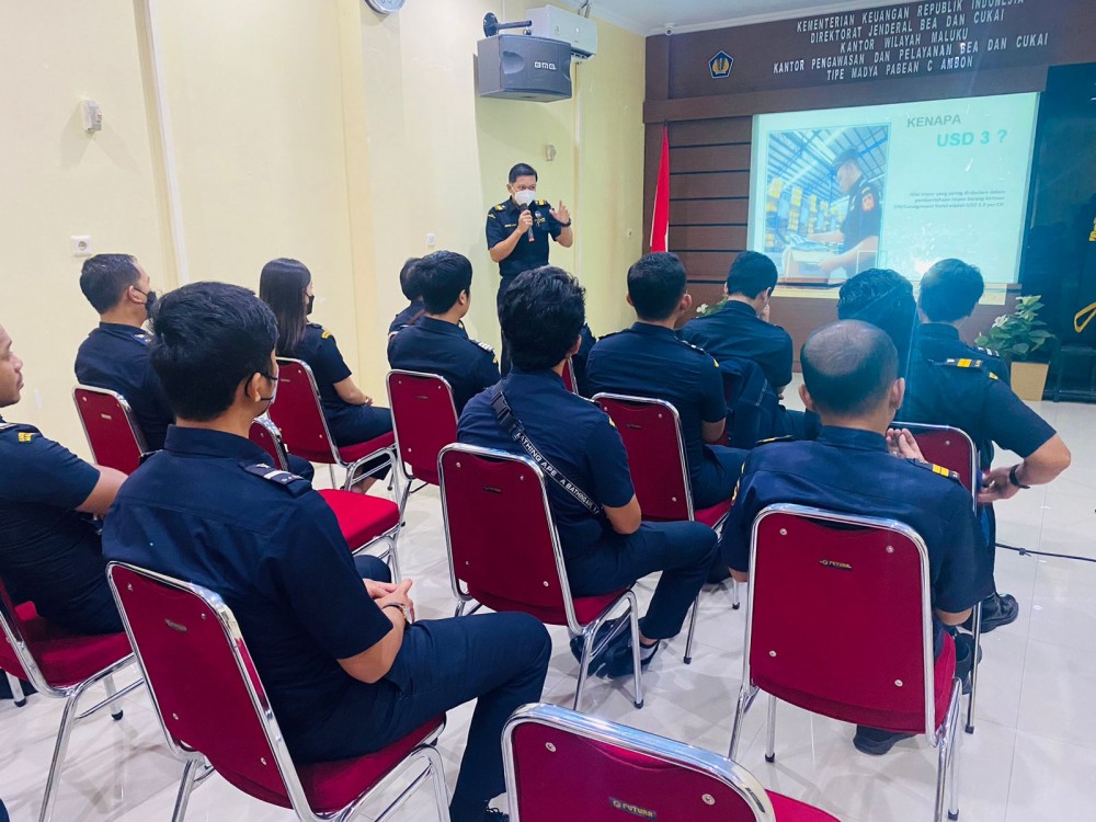 Ambon (15/12/2022) Kemarin pagi (14/12) Bea Cukai Ambon melaksanakan In House Training. Kegiatan ini dibawakan oleh Herman Jusuf dengan materi terkait ketentuan kepabeanan, cukai, dan pajak atas impor barang kiriman. Herman yang pernah bertugas di bandara Soetta dan menangani terkait barang kiriman membagi ilmu dan pengalamannyan kepada pegawai Bea Cukai Ambon.