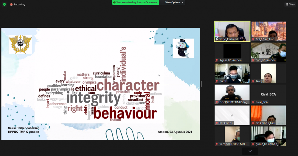 Ambon(03/08/2021) Mengawali Selasa pagi, Bea Cukai Ambon menggelar briefing kepada seluruh pegawai bertemakan “My integrity My Identity” yang dilaksanakan secara Daring. Integritas atau dalam bahasa latin disebut “Integer” memiliki makna sikap yang teguh mempertahankan prinsip, tidak mau korupsi, dan menjadi dasar yang melekat pada diri sendiri sebagai nilai-nilai moral.