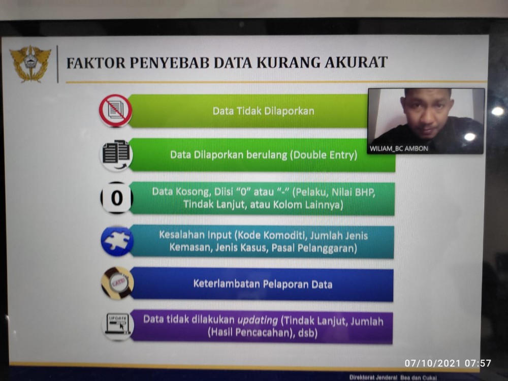 Sejalan dengan peran utama Bea Cukai yaitu Community Protector untuk mengoptimalkan pelaksanaan fungsi pengawasan, pada kesempatan sharing session kali ini Kamis (7/10) Pelaksana pada seksi Penindakan dan Penyidikan, Wiliam B Dakael secara hybrid, mengajak pegawai Bea Cukai Ambon untuk mempelajari aplikasi Penindakan DJBC.