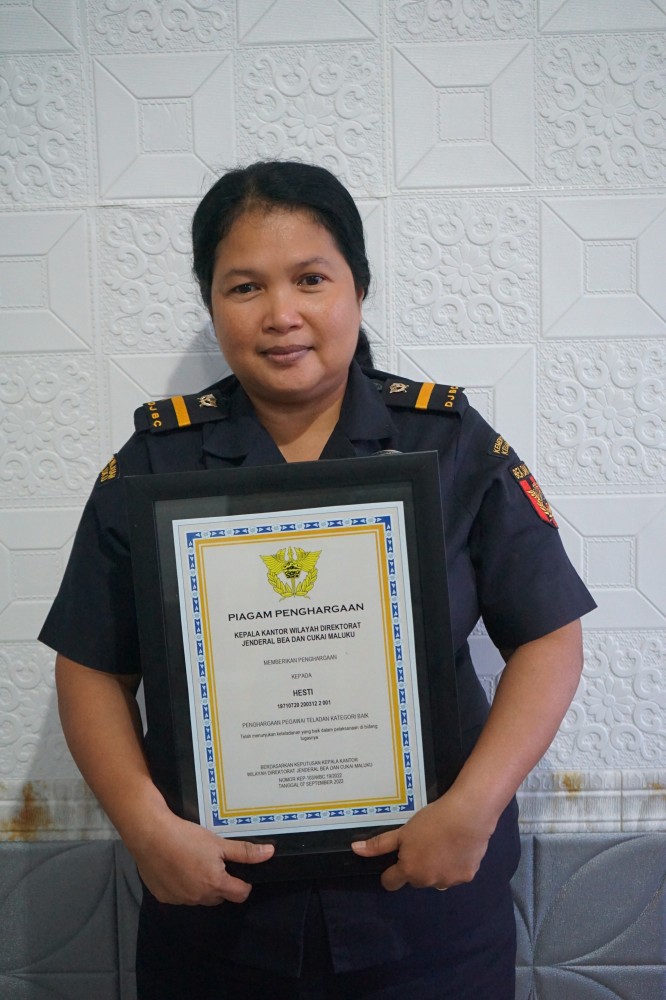 Iya, Hesti PBC Ahli Pertama Bea Cukai Ambon yang telah meniti karir di Bea Cukai selama kurang lebih 19 tahun akhirnya menerima penghargaan dari Kepala Kantor Wilayah DJBC Maluku sebagai salah satu pegawai Teladan Kategori Baik berdasarkan Keputusan Kepala Kantor Wilayah DJBC Maluku nomor KEP-103/WBC.19/2022 bersama 11 pegawai Bea Cukai yang lain di lingkungan Kantor Wilayah DJBC Maluku. Selain Hesti, pegawai yang lain ada yang menerima penghargaan sebagai Pegawai berprestasi amat baik dan Best Employee of the Month.