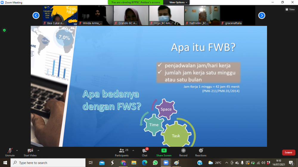 Dengan memperhatikan dengan ketat protokol kesehatan, pegawai yang dijadwalkan ke Kantor mengikuti secara luring dan pegawai yang tidak dijadwalkan ke kantor mengikuti secara daring melalui Zoom Meeting. Penjelasan yang sangat rinci diberikan sebagai pemahaman bagi pegawai Bea Cukai Ambon.