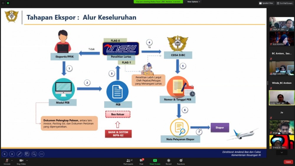 Pemateri Andry Fauzi dan Dion Bramasta, membahas mengenai mekanisme pelayanan ekspor dari Bandara Internasional Pattimura Ambon antara lain dimulai dari absensi petugas di sistem aplikasi ekspor, memastikan PEB eksportir sudah terbit NPE, memastikan jumlah kolli barang ekspor yang masuk Kawasan Pabean sesuai dengan NPEnya, melakukan penyegelan karena pelabuhan asal berbeda dengan pelabuhan muat ekspor, memeriksa hardcopy dokumen ekspor yg diberikan kepada petugas, serta memastikan barang termuat di sarana pengangkut dan berangkat terbang dari bandara.