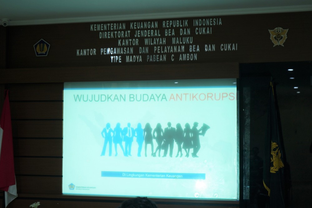 Dalam rangkaian sosialisasi Antikorupsi, Bea Cukai Ambon mengawali hari dengan sosialisasi bertemakan Wujudkan Budaya Antikorupsi. Pemaparan oleh dibawakan oleh Kepala Subbagian Umum Guruh Supenget yang sekaligus penyuluh antikorupsi dari KPK.